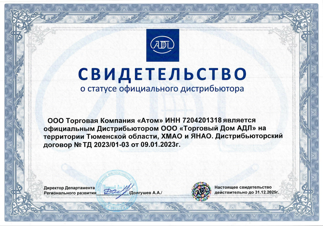 Сертификат, свидетельствующий о том, что ООО Торговая компания "Атом" является официальным серфисным партнером ООО "Торговый Дом АДЛ" на территории г. Тюмени и Тюменской области. |